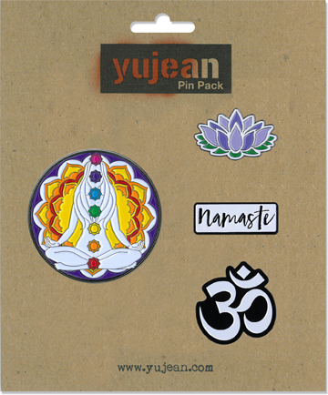 Namaste.....  Yujean's exclusive Yoga enamel pin set! Four top quality enamel pins, in icons you love: amazing jumbo Shakra 2" pin, Lotus 1.25 x .78" pin, Namaste 1.25" pin, and Om 1.25" pin. Art by Matt Stewart.